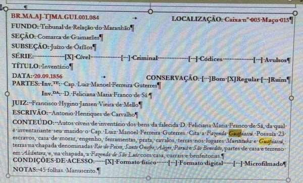 Em 1856 foi assinado o Inventário de D. Feliciana Maria Franco de Sá, esposa do inventariante, o capitão Luiz Manoel Ferreira Guterres. Eram proprietários, entre outras, de terras no lugar "Alegre" e da "Fazenda Guapiassú".