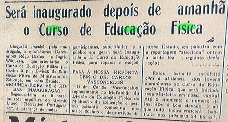 Cabe lembrar, aqui, que em 1952, no dia 24 de abril, em O Combate, era anunciado a abertura do CURSO DE EDUCAÇÃOFÍSICAparaodia1ºdemaio:serianoAeroClubedoMaranhão,einiciativadeRubemTeixeira Goulart.