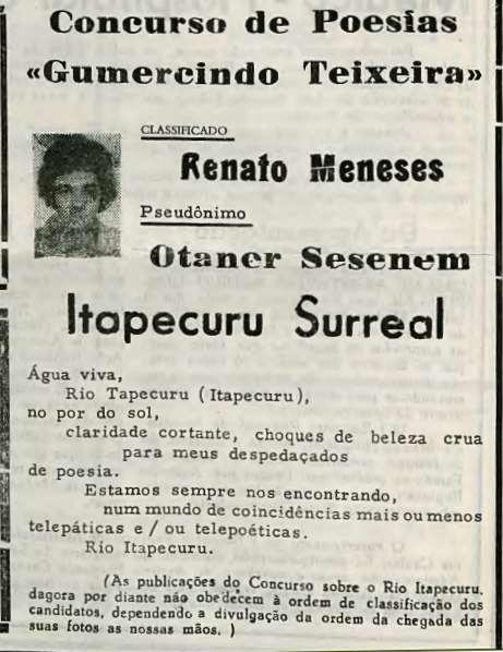 “Qualquer semelhança com um movimento morto é mera coincidência”, alertavam já na primeira edição do Suplemento Guarnicê, evitando comparações com os integrantes da antologia Hora do Guarnicê (Poesia nova do Maranhão), lançada em São Luis em 1975 pela Fundação Cultural do Maranhão (LIMA, 2003) 24 . Hora do Guarnicê foi um livro, uma antologia da jovem poesia da primeira metade da década de 70 no Maranhão, tendo congregado, num ponto de convergência, integrantes do Movimento Antroponáutica: