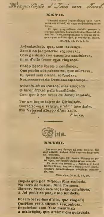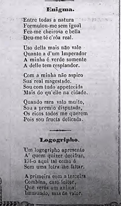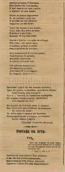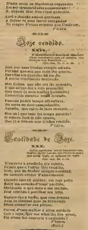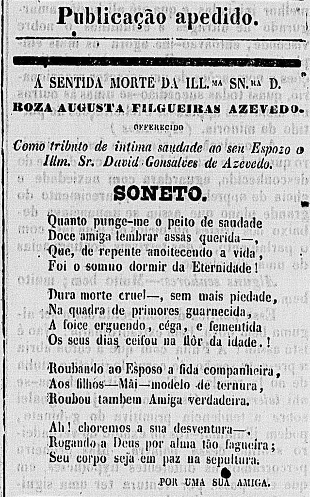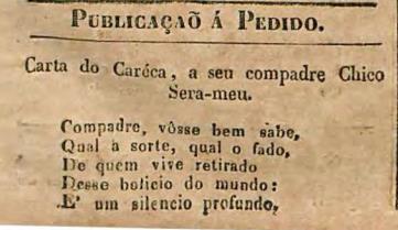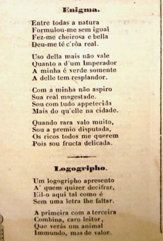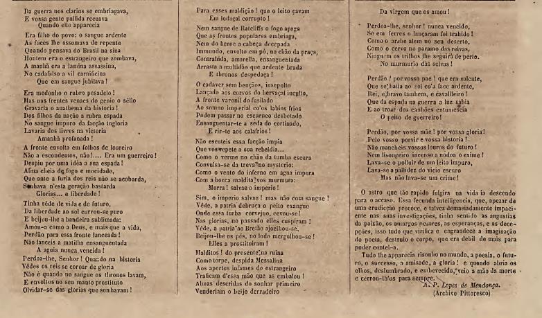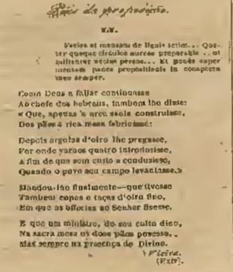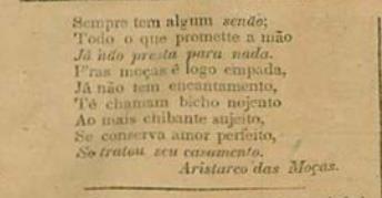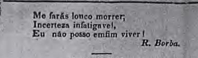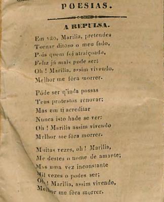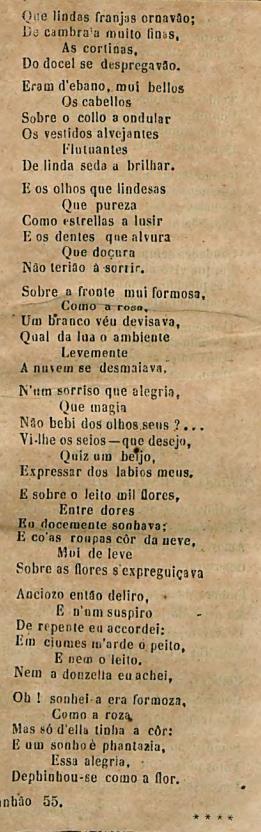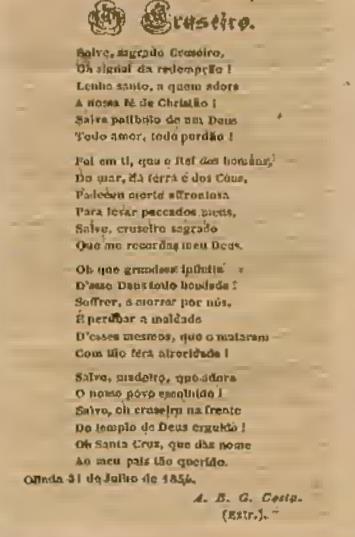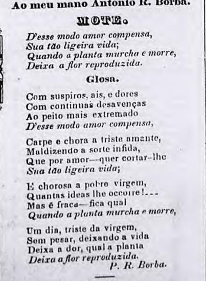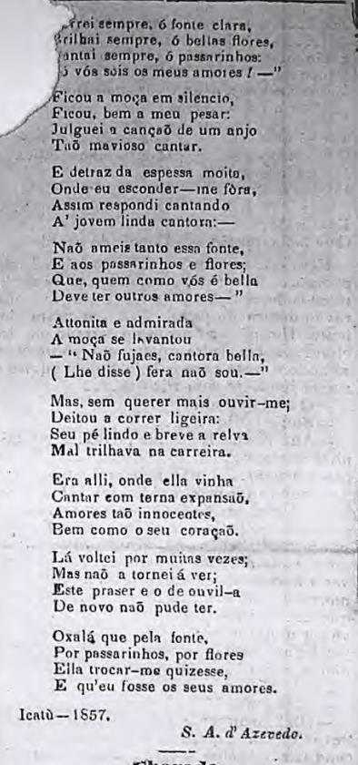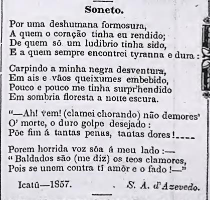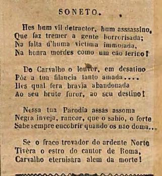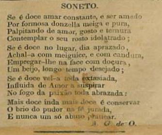 A partir dos anos 1840, aparecem muitas poesias, publicadas em diversos jornais do período. É de 1840 o seguinte soneto, de autoria de Ignácio José Ferreira.