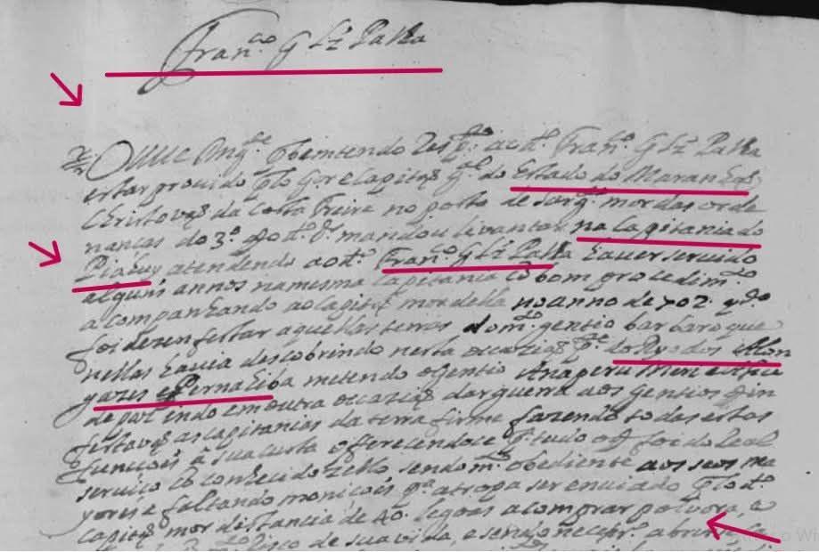 Imagem: Trecho da Carta Patente de Francisco Gonçalves Palha passada em 1710 pelo Governador do Estado do Maranhão.