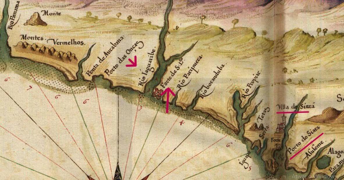 Imagem: Recorte do Mapa de Albernaz de 1640 "Descrição de todo o marítimo da terra de Santa Cruz chamado vulgarmente o Brasil", de João Teixeira Albernaz - Arquivo Nacional da Torre do Tombo, Portugal - Colecção Cartográfica, n.º 162. p. 144