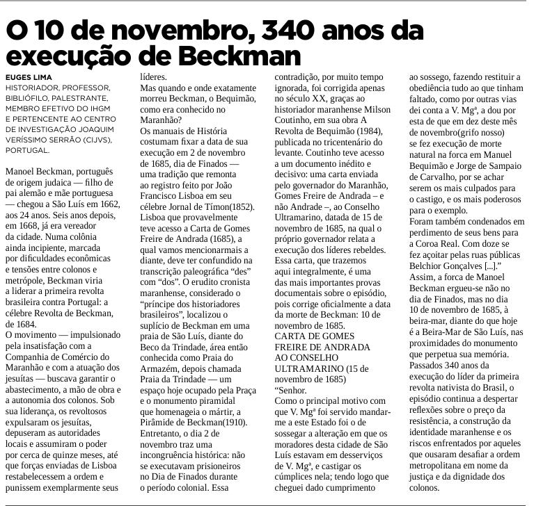 340 ANOS DE EXECUÇÃO DE BECKMAN – EUGES LIMA