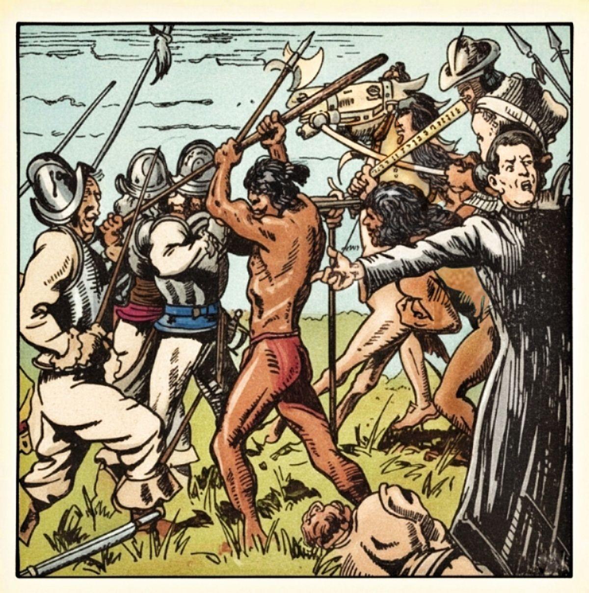O PADRE LOPO DO COUTO LIDERANDO UM ATAQUE AOS HOLANDESES NO MARANHÃO EM 1642. ILUSTRAÇÃO DE RODOLFO ILTZSCHE PARA A REVISTA "SUPLEMENTO JUVENIL" 1943