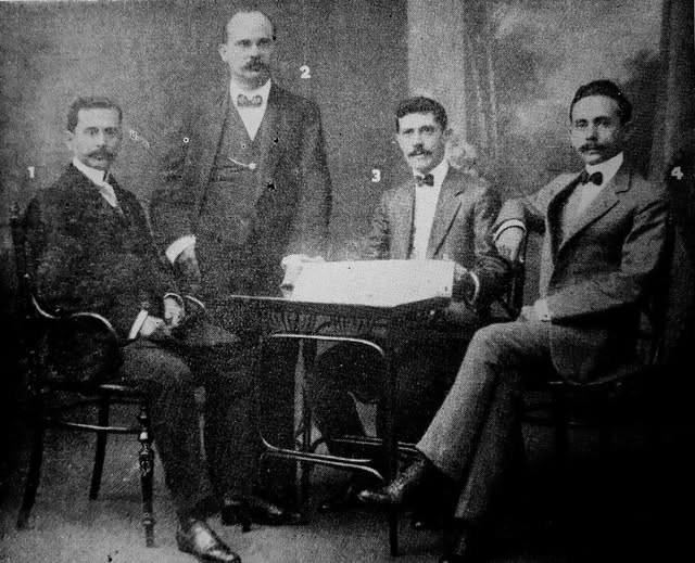 Integrantes da redação do jornal A Pacotilha, que funcionou em um casarão de azulejos verdes, remanescente do sec. XVIII, localizado na esquina do Beco da Pacotilha (Rua João Victal de Matos) com o Largo do Carmo (Praça João Lisboa), em São Luís (estado do Maranhão - Brasil).