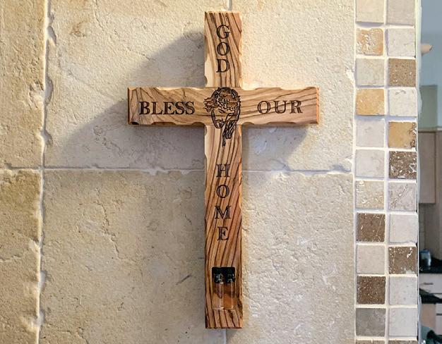 Expertly hand carved olive wood cross. Featuring ‘God Bless Our Home’, the Holy face of Jesus Christ and two small bottles of Holy Oil and Holy Water, one of each. Products might vary slightly from the picture due to being handmade from Olive Wood. Made in Bethlehem. Features hook at the back to easily hang. Size: 10.5 x 16 x 1.5cm.