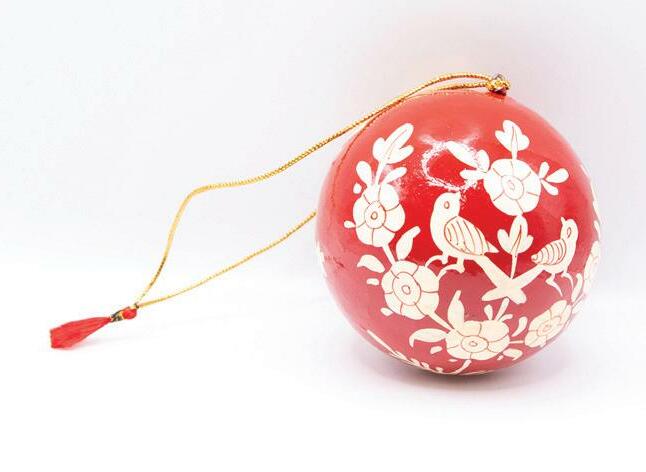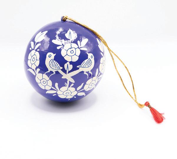 Intricately decorated set of two papier mache baubles. Bird and flower designs handpainted on striking blue and red colours to compliment any Christmas colour theme. Handmade in India by people affected by leprosy and disability. Size: 10cm diameter.