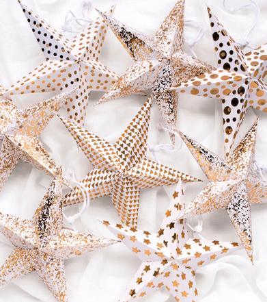 Pack of 8 mini recycled paper hanging star decorations. Designed with gold foil prints on each unique paper star. The recycled handmade paper used is entirely natural and eco-friendly. Stars are packaged flat and designed to be popped open like origami with a drawstring to keep open and hang on your tree. Handmade in India. Size: 22.5 x 4cm