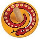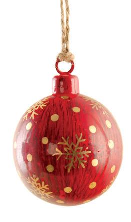 An antique red and gold bauble, hand finished with golden snowflakes and polka dot painted design. The wooden piece is unbreakable and tied with a rustic jute hanging thread. Hang from a tree, a mantelpiece or a doorway for a welcoming touch. Handmade in India. Size: 7cm diameter