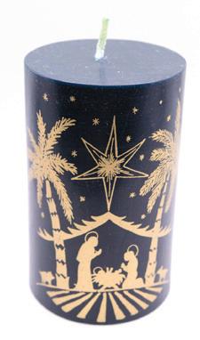 Handmade wax candle in a colour as black as the night sku with a pop of gold coloured hand paint details. Features a gold nativity scene under the starry sky design. Handmade by artisans affected by leprosy and disability in India through Fair Trade practices. Comes Gift Boxed. Size: 12 x 7cm