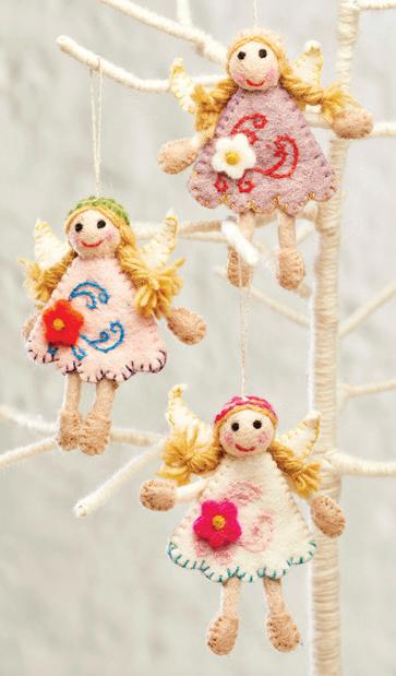 A cute handcrafted wool felt angel decoration with hanging thread. A perfect Christmas decoration for all! Made from eco friendly soft felt, it will become an annual favourite and last forever. Each decoration is handmade and decorated making each design unique. Chosen for you at random. Handmade in Nepal from 100% wool felt. 10x12x2.5cm