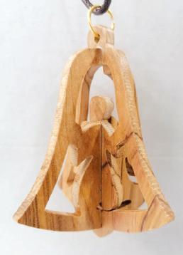 Handcrafted in Bethlehem from olive wood, this bell shaped 3D ornament features an angel on the inside. Add a special handmade ornament to your tree! Size: 7 x 7cm