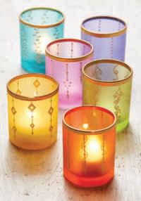 Gold around the lip and ornamental detailing. Glass tealight holders are a great gift solution! Handmade in India. Colours are assorted and chosen for you at random. Each sold individually. Size: 7 x 7 x 8.5 cm