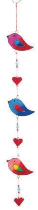 A birds and hearts suncatcher with 3 of each, separated by little bead details. An uplifting and colourful piece that can be displayed. Displayed in a window, conservatory, or hung on a wall, it adds a warm and welcoming touch. Hanging loop is attached. Handmade in Indonesia. Size: 7.5 x 53cm