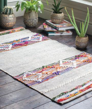 A hard wearing cotton and jute rug of typical Indian style. Made on a handloom, the geometric pattern and colour definition is a striking combination. Trimmed with tassels, accented with matching thread, this traditionally printed rug is finished to perfection. A positive statement piece. Handmade in India. Size: 90 x 150cm