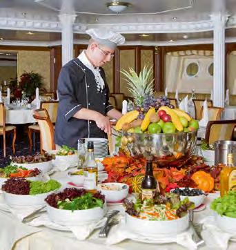 An Bord werden Sie kulinarisch mit exzellenter europäischer Küche verwöhnt, zum Mittag- und Abendessen sind Tischgetränke (Bier, Hausweine, Erfrischungsgetränke) bereits inklusive.