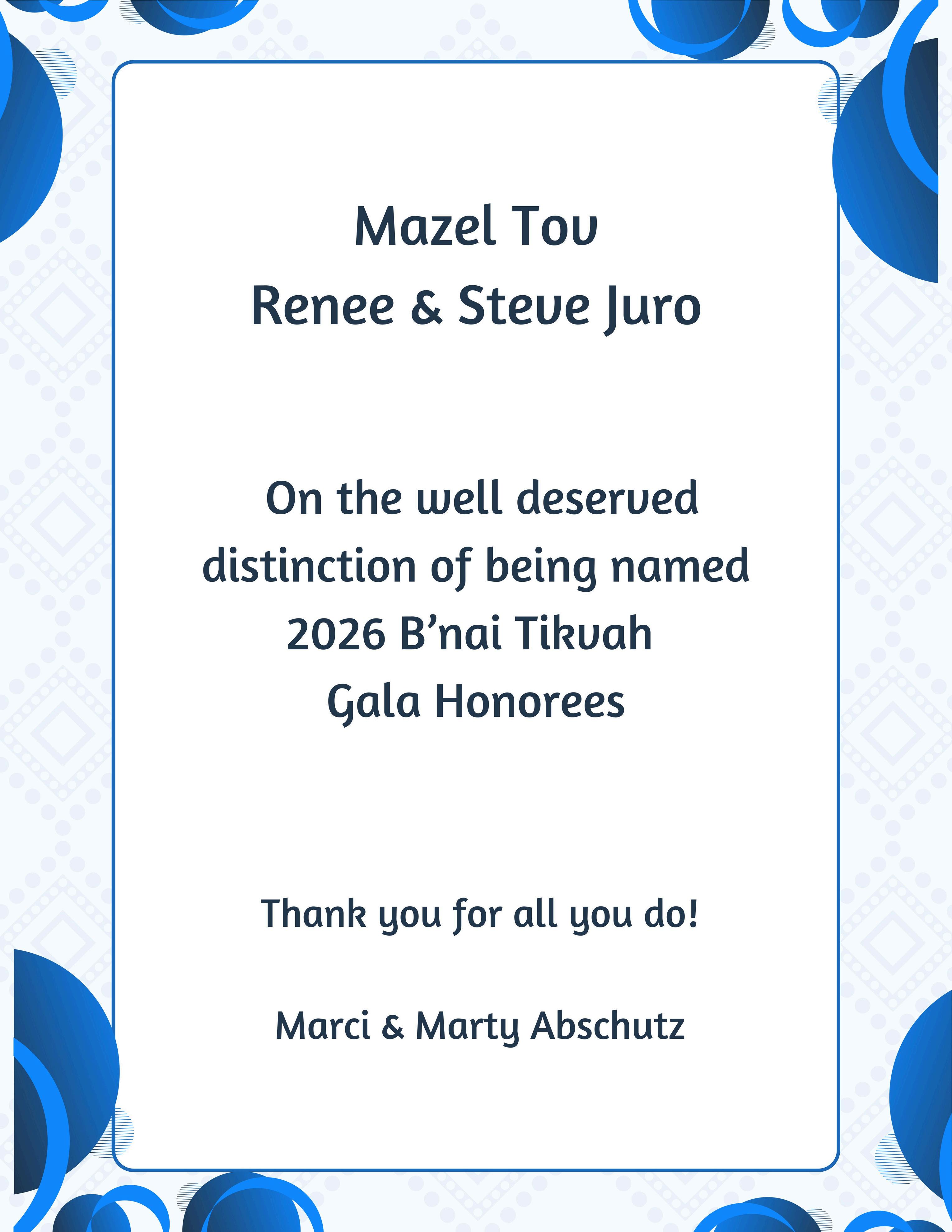Honoring Steve and Renee Juro for their dedication and service to our synagogue. Their commitment strengthens our community, supports our traditions, and inspires others to give generously of time and talents. With gratitude, we recognize their lasting impact. - Shelly and Steve Talmud