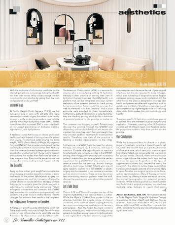 Furthermore, a MWMP fuels the need for vitamin therapy, including B-12, B complex, and Lipo-C injections. Consider offering a discount on injections to patients who are currently enrolled in the MWMP. Among other things, these services both increase a patient’s metabolism and energy levels—the perfect supplement for a MWMP that also creates a new revenue stream for the practice. Vitamin therapy attracts a much larger market. Patients who are not quite ready to commit to a full MWMP or plastic surgery may be interested in less invasive procedures, such as vitamin injections. These services become a less intimidating way for patients meet the staff, discover the practice, and learn about other potential services.