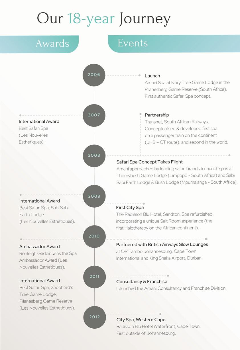 addition, I have had the great pleasure of consulting with leading wellness destinations and in-house spas including Grand Hyatt Melbourne; Gwinganna Lifestyle Retreat, Australia; The Four Seasons, Bali; Kempinski Zamani Resort, Zanzibar, Tanzania; Kahanda Kanda, Sri Lanka; and in Canada at Grail Springs in Bancroft, Ontario.