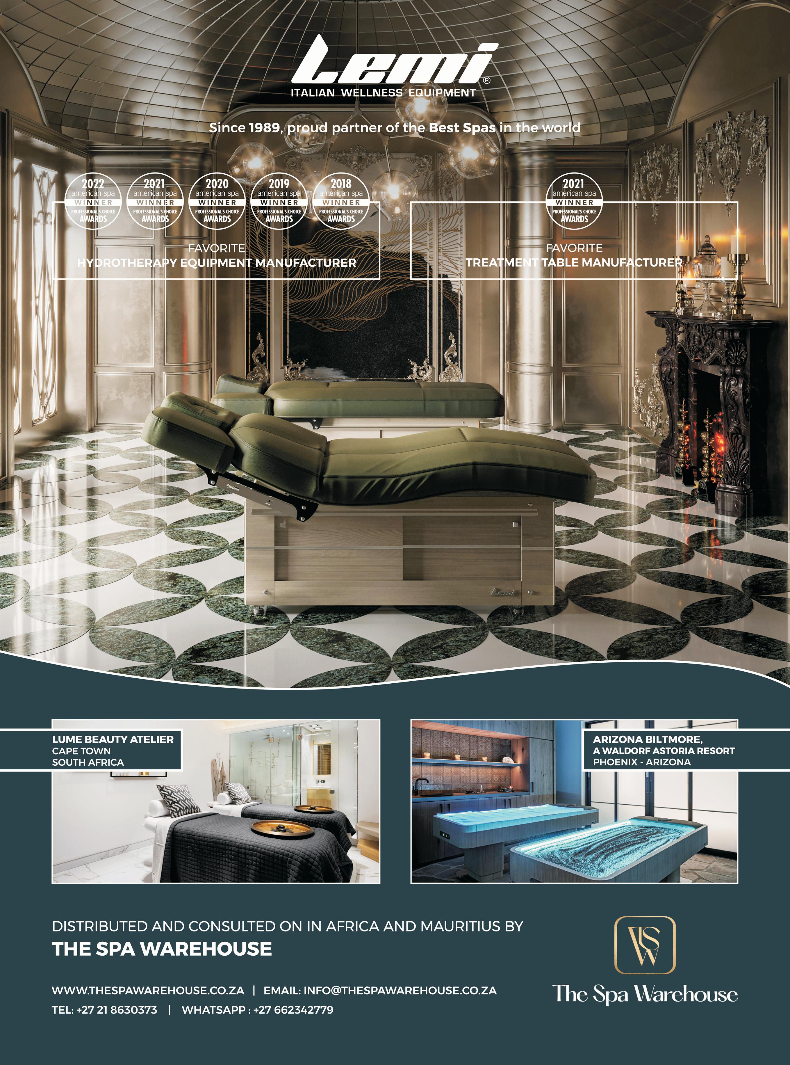 Les Nouvelles Esthétiques South African Edition I Max Cafe P. O. Box 81204, Parkhurst Johannesburg, South Africa 2120 I Tel: +27 83 267 2773 e-mail: info@lesnouvelles.co.za www.lesnouvelles.co.za I Publisher/Creative Director: Anthony de Freitas e-mail: tony@maxcaf e.co.za I Managing Editor: Dr. Nadine de Freitas e-mail: nadine@maxcafe.co.za I Editorial Assistant: Sarene Kloren editorial @lesnouvelles.co.za I Ad vertising Enquiries: Dr Nadine de Freitas e-mail: info@lesnouvelles.co.za I Subscription Enquiries: Tel: +27 83 267 2773 e-mail: info@lesnouvelles .co.za or visit: www.lesnouvelles.co.za Les Nouvelles Esthetiques International Publisher I 7, avenue Stephane Mallarme 75017 PARIS Tel: 01 43 80 06 47 Fax: 01 43 80 83 63 www.nouvelles-esthetiques.com I Fondateur: H. Pierantoni I Directeur de la Publications: Jeannine Cannac-Pierantoni I Redactrice en chef: Michéle de La ttre-Pierantoni I International Editions • Argentina • Baltic • Benelux • Brazil • Bulgaria • Canada • China • France • Greece • Hong Kong • Hungary • Israel • Italy • Japan • Mexico • Poland • Portugal • Romania • Singapore • South Africa • Spain • Taiwan • Turkey • Ukraine • USA • Yugoslavia Doc: Six Senses Spas skin vitality body balance A Professional take on SPA Business, Health Therapies, Products & Simple Relaxation 2023*ISSUE*95 cover CONTENTS *95
