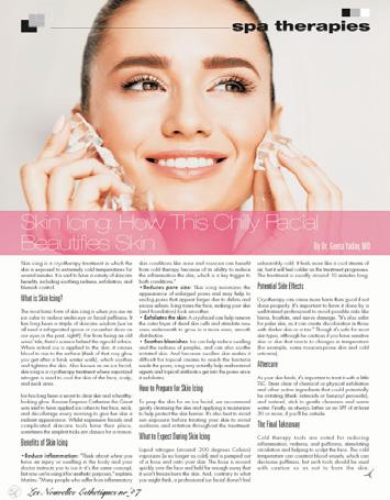 Skin icing is a cryotherapy treatment in which the skinisexposedto extremely cold temperatures for several minutes. It is said to have a variety of skincare benefits, including soothing redness, exfoliation, and blemish control.