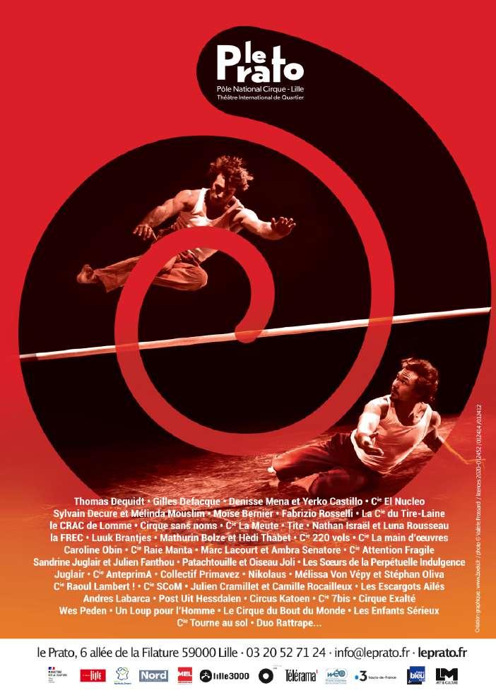 Le Prato investit la Gare Saint-Sauveur avec une myriade d'artistes épa tants, à commencer par Tite, tout à la fois clown, transformiste et funam bule. Dans Mirabon et dentelle, elle part à la rencontre de sa féminité, pour le meilleur et le rire. Tandis que deux acrobates interrogent le sens de la vie dans une roue de la mort, Abaque nous plonge dans une ambiance de brocante. Sous ce chapiteau, une jongleuse, une contorsionniste, un hommeorchestre et un équilibriste y refont le monde à leur sauce.