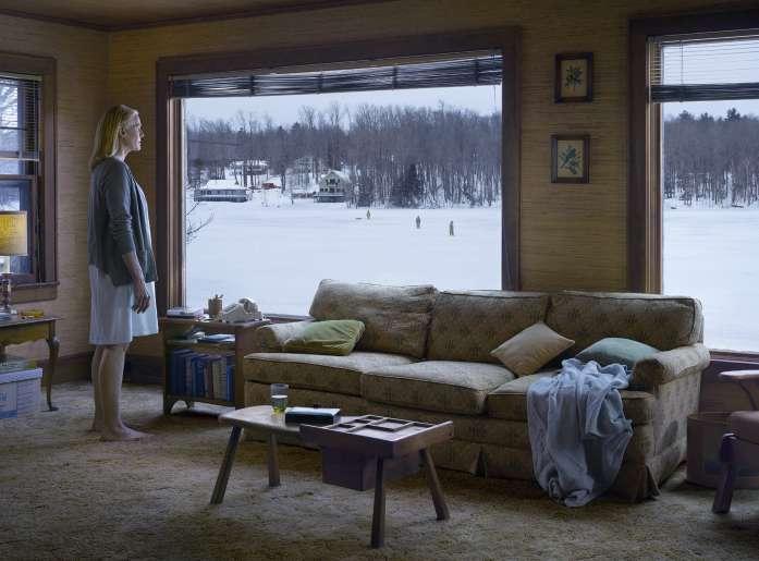En totale immersion – La visite débute avec la série Cathedral of the Pines. Des images en couleur, baignées d’une lumière douce. Parmi elles, The Disturbance, montre une femme dans une maison en bois, trois individus à la lisière d’une forêt, la neige qui absorbe les sons. Réalisé dans le Massachusetts, cet ensemble marque un retour à la création après une période de silence. On y sent l’idée de refuge, de