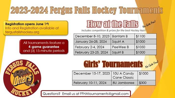 23-25 Fergus Falls, MN. Flow at the Falls Squirt B Tournament. Squirt B. Contact at ffhatournaments@ gmail.com . Register at www.fergusfallshockey.org .