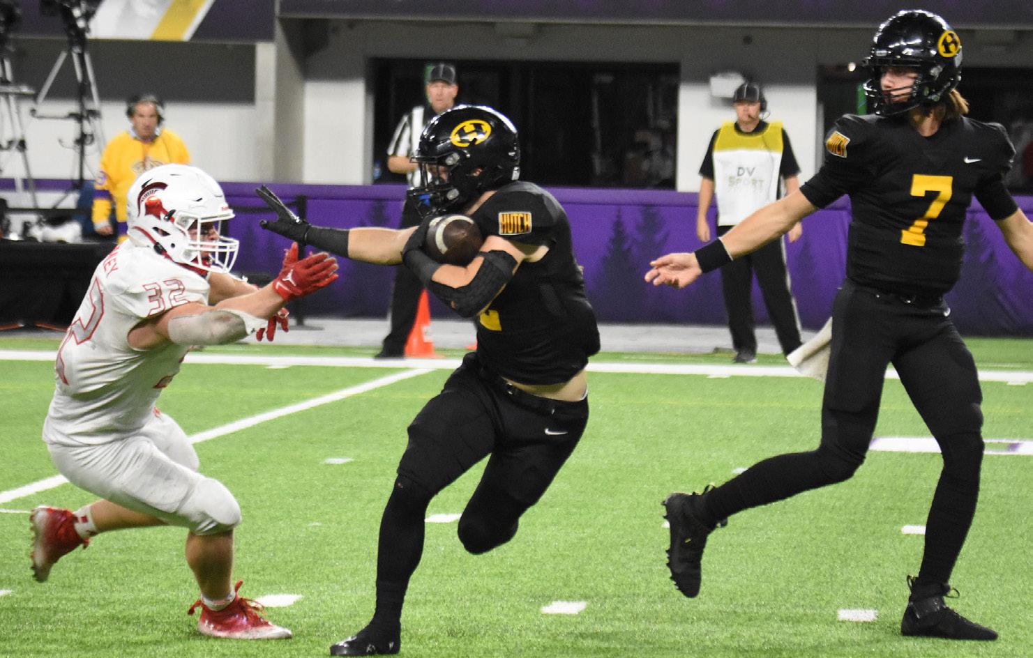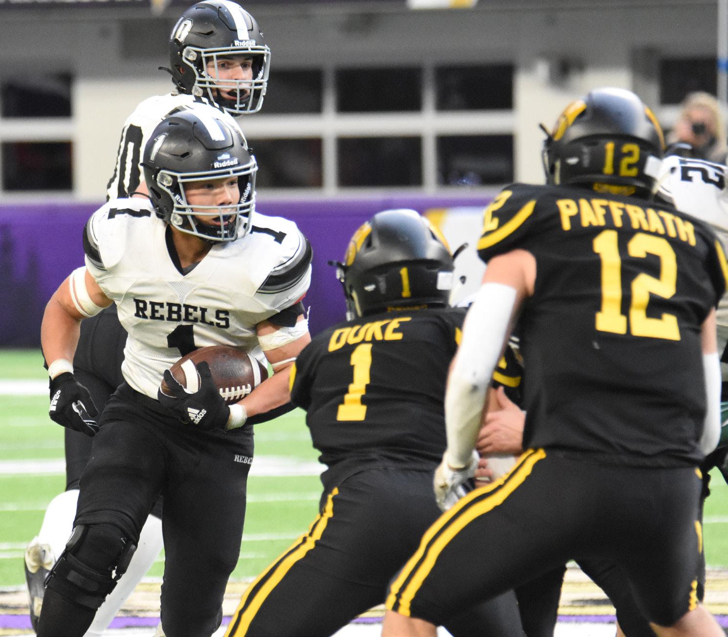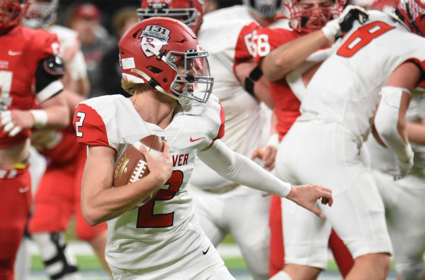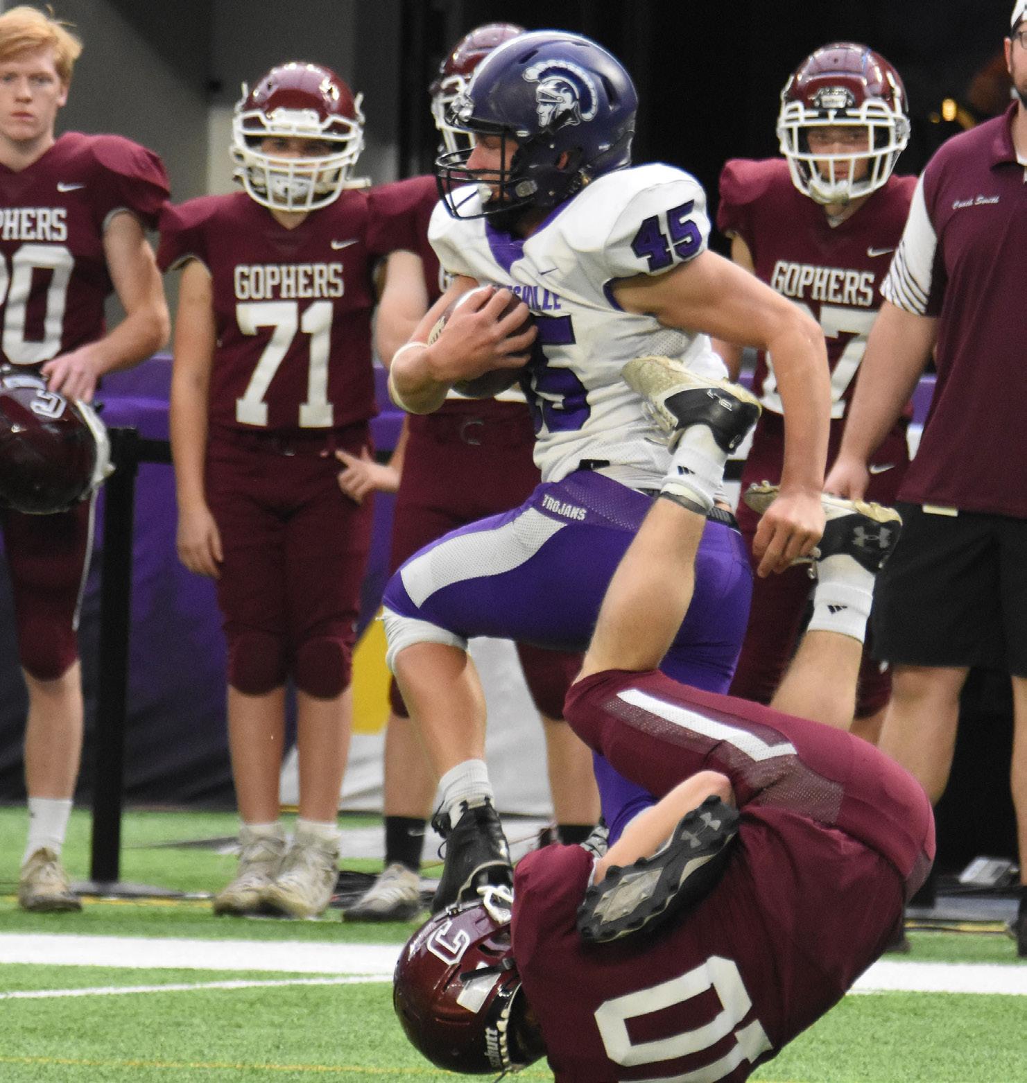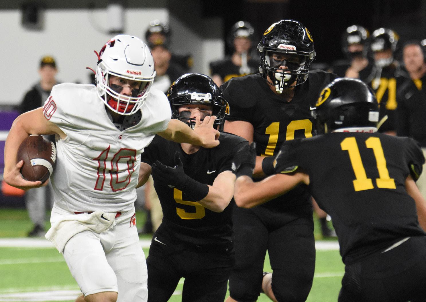 Barnesville learns from past, ride seniors to first state titlePHOTOS BY TOM FENTON Barnesville running back John Roller (21) gains the corner as Chatfield safety Carter Daniels (5) moves in during the Class AA state championship game at Prep Bowl Dec. 2 at U.S. Bank Stadium in Minneapolis. Barnesville won its first championship with a 35-20 victory over the defending champion Gophers. Barnesville defensive back Ethan Larson (45) returns the ball after intercepting a Springfield pass during the Class AA state championship game at Prep Bowl Dec. 2 at U.S. Bank Stadium in Minneapolis. Going for the tackle is Springfield’s Eli Hopp (10). Barnesville running back Ethan Larson (45) hits a hole created by offensive lineman Jonathan Robideau (54) during the Class AA state championship game at Prep Bowl Dec. 2 at U.S. Bank Stadium in Minneapolis.