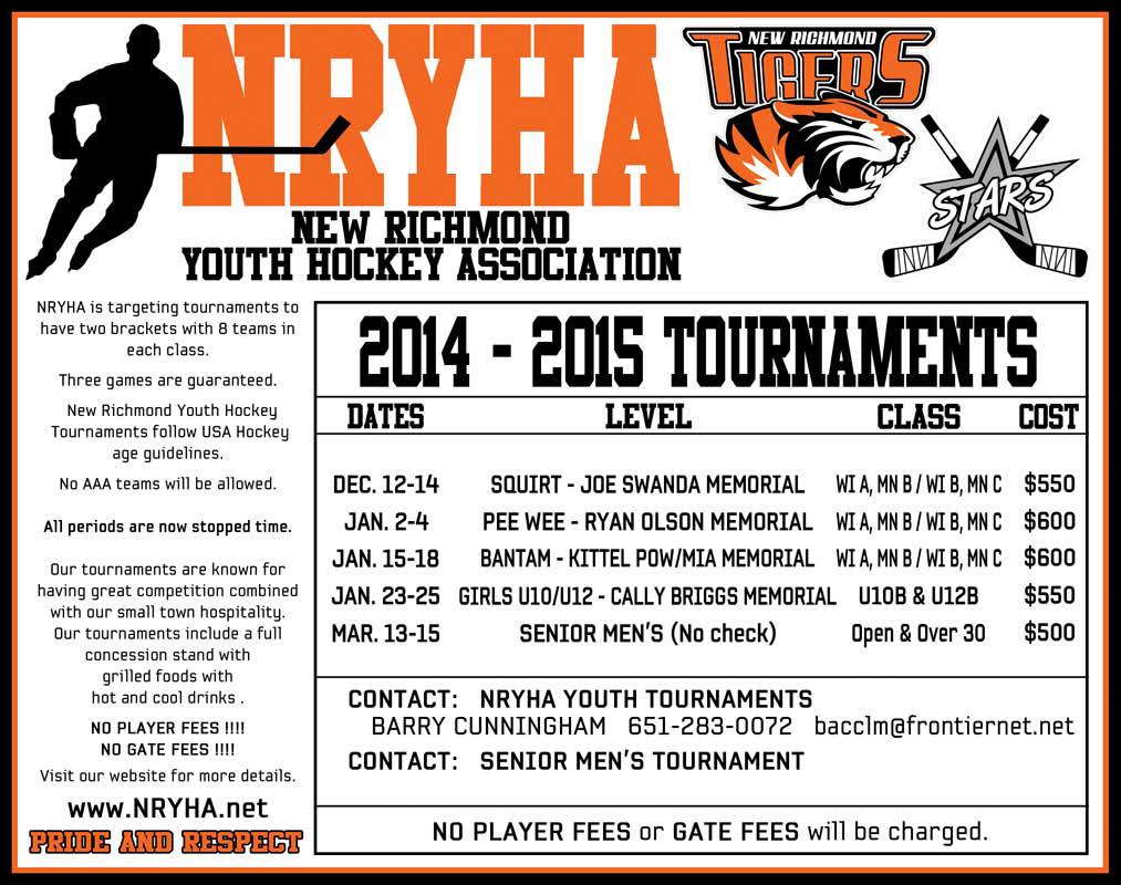 3-5 New Richmond, WI. Tiger Winter Classic. Peewee C, Squirt C. Contact Tournaments@nryha.net. Register at https://www. nryha.net/page/show/193714-our-tournaments.