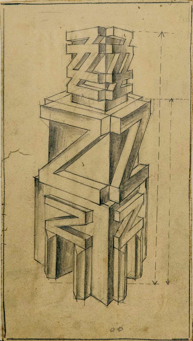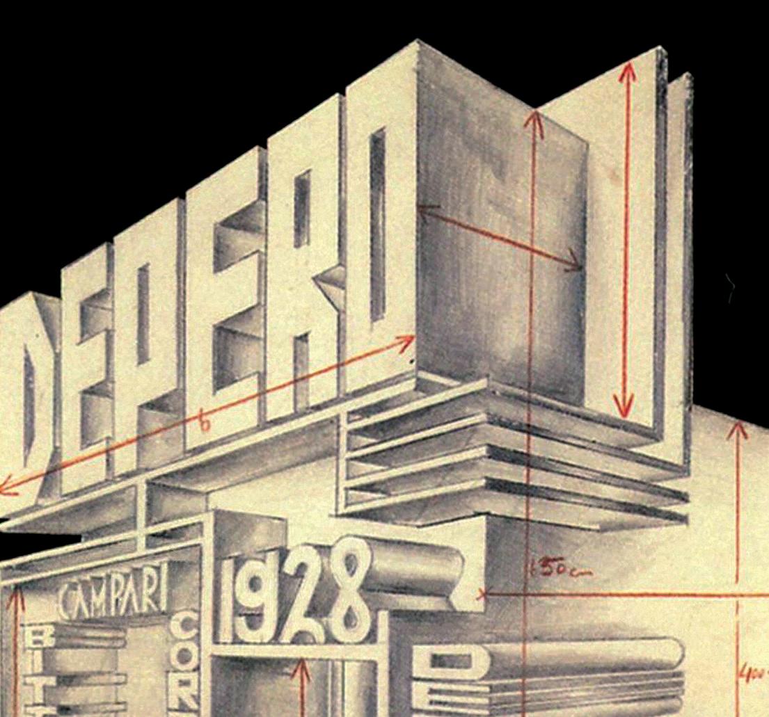 secondo il criterio per cui la forma dovrebbe essere determinata dagli oggetti che contengono e per i quali sono costruiti. Nel padiglione espositivo di Monza la struttura si compone di enormi, aggettanti, squadrati caratteri tipografici che ben rappresentano le pulsioni plastico-costruttive della cosiddetta «architettura dell’effimero», con cui nel corso degli anni Venti Depero si trovò a confrontarsi e che diede vita a allestimenti di ambienti e padiglioni fieristici dove dare corpo alle sue formulazioni di plastica pubblicitaria.