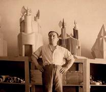 Fortunato Depero nel suo studio,con i plastici dei padiglioni, 1926.