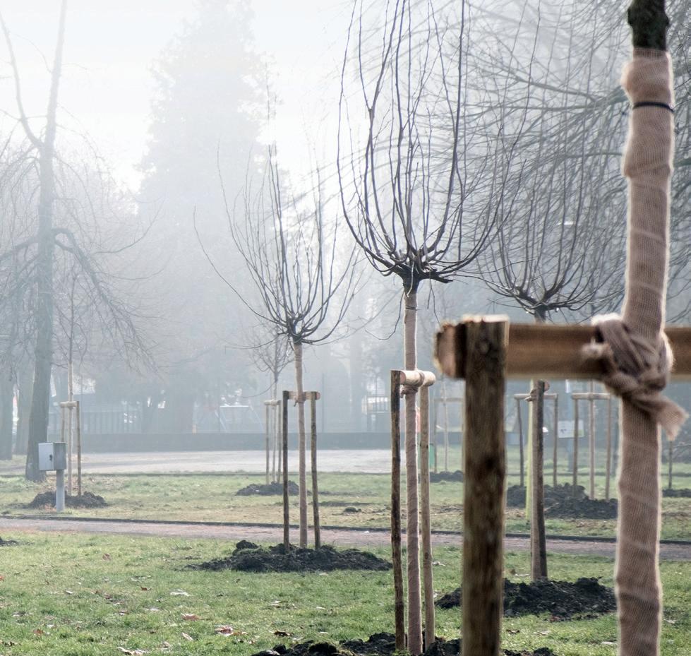 Il bosco, mutevole al variare delle stagioni, forma con le chiome degli alberi un “tetto verde” che racchiude questo grande vuoto circolare destinato ad essere fulcro di giochi e attività di quartiere. Sono state scelte specie già presenti nel territorio: Morus alba “fruitless”, Platanus acerifolia, Acer campestre, Fraxinus angustifolia, Carpinus betulus.