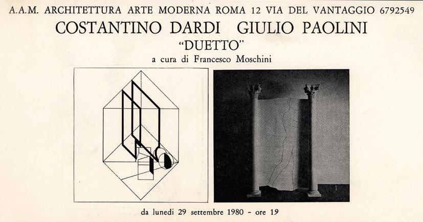 Costantino Dardi / Giulio Paolini ”DUETTO”, invito dell’omonima mostra a cura di Francesco Moschini tenutasi presso A.A.M. Architettura Arte Moderna, 2 ottobre 1980. 10x21 cm. Courtesy e copyright: FFMAAM | Fondo Francesco Moschini A.A.M. Architettura Arte Moderna.