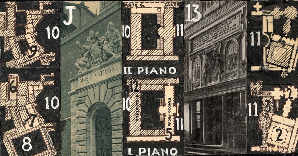 Collage dei Musei Vaticani, della cupola di San Pietro e delle Terme di Diocleziano. Collezione MAXXI Architettura, Archivio Moretti Magnifico.