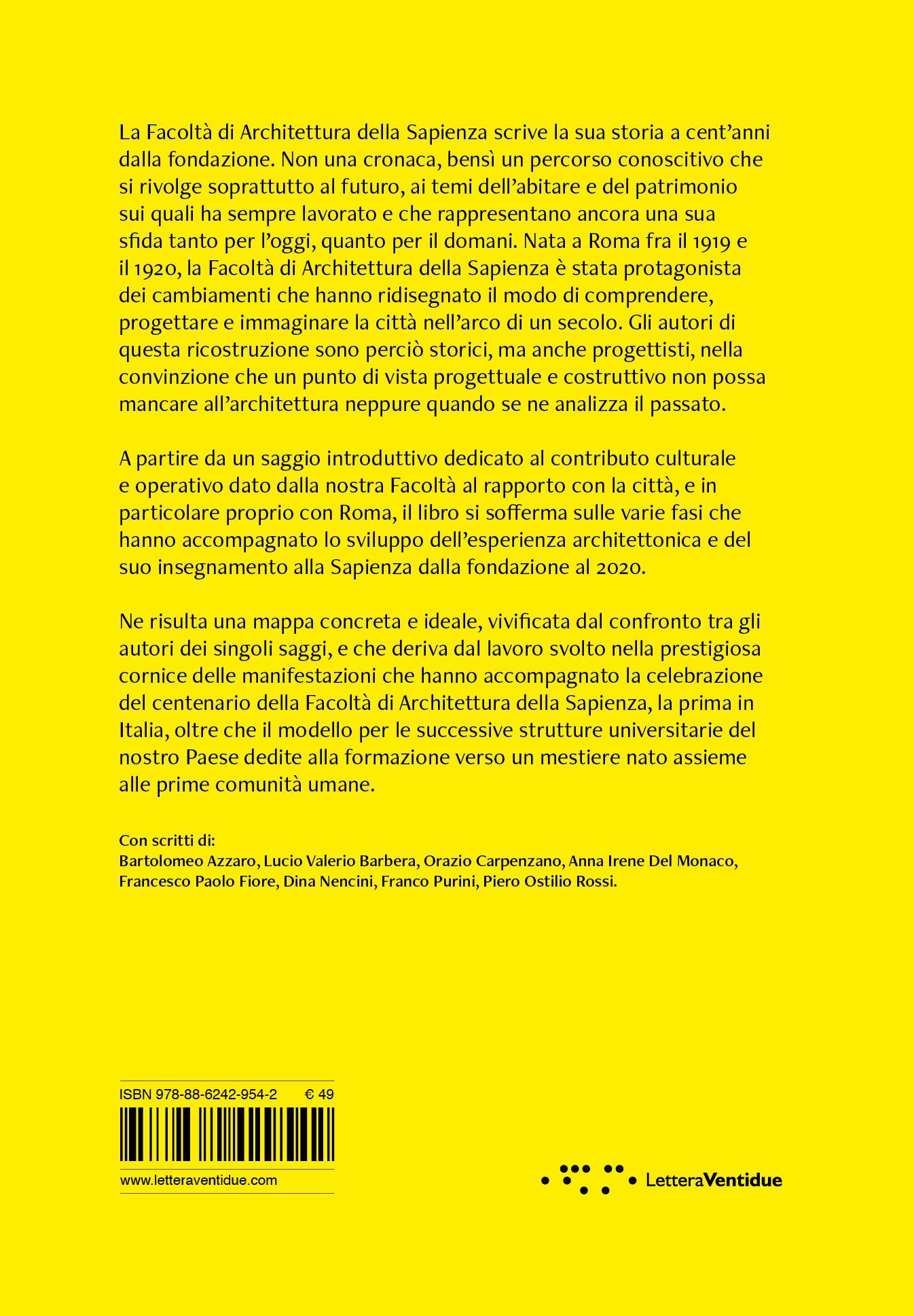 Avendo seguito la gestazione e l’elaborazione delle ricerche che hanno portato alla stesura dei testi durante il mio mandato di Direttore del Dipartimento di Architettura e Progetto ed avendo seguito direttamente la fase conclusiva della redazione del volume durante il mio mandato di Preside della Facoltà di Architettura della Sapienza, ritengo di avere l’obbligo, a nome di tutta la Facoltà, di ringraziare gli autori Franco Purini, Bartolomeo Azzaro, Lucio Barbera, Piero Ostilio Rossi, Francesco Paolo Fiore, Anna Irene Del Monaco, Dina Nencini che hanno contribuito a costruire queste belle pagine e tutti coloro che si sono resi disponibili ad interloquire con loro, consentendoci di comporre una vicenda fatta di molte storie individuali che si intrecciano con una storia più ampia, lunga un secolo, cioè quella della Facoltà, dei suoi allievi, dei suoi docenti, nel suo Ateneo e nella sua città.