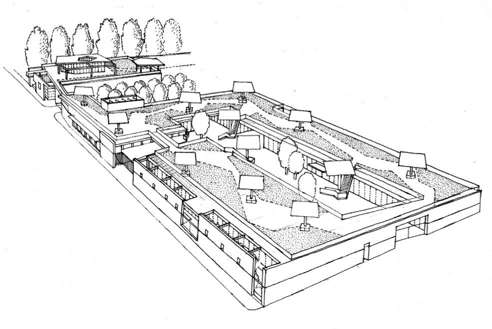 Vista prospettica e schizzi di studio del progetto per l’ampliamento della Facoltà Ludovico Quaroni nel Borghetto Flaminio, responsabile scientifico Giuseppe Rebecchini.