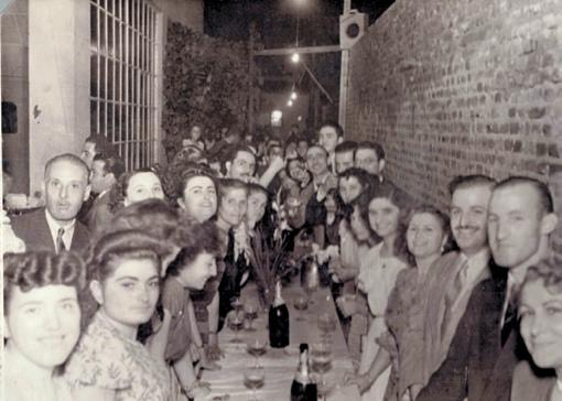 La festa di matrimonio di alcuni componenti della famiglia Mazzola, che si svolgeva nello stretto spazio esterno davanti al ballatoio/portico, 1950. La fiesta de bodas de algunos miembros de la familia Mazzolla, que se llevaba a cabo en el estrecho espacio exterior frente a la galería/entrada, 1950.
