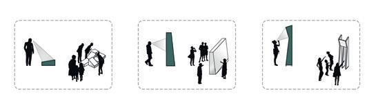 Axonometry of the three exhibition spaces with a diagrammatic indication of viewpoints