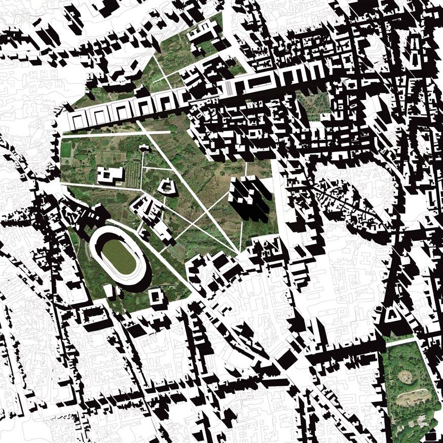 che attraversa da sud-est a nord-ovest la città. Si individua, così, un “tessuto di innesto” sul quale si articola una sequenza di scelte fondanti che coinvolgono, ridisegnandoli, lo stadio, la piazza di Cibali, un nuovo Palazzetto dello Sport e la rete degli attraversamenti e della viabilità non solo in direzione nord-sud, ma anche in quella est-ovest approfttando dell’ampia fascia di vuoti, giardini, recinti agricoli e ville che si saldano in un unico parco urbano.