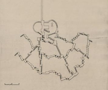 3.13 Assonometria dello schema di circolazione del Collegio Universitario il Colle a Urbino (1960-87) progettato da Giancarlo De Carlo con Francesco Borella, Astolfo Sartori, Lucio Seraghiti e Vittorio Korach. AP IUAV / FGDC.