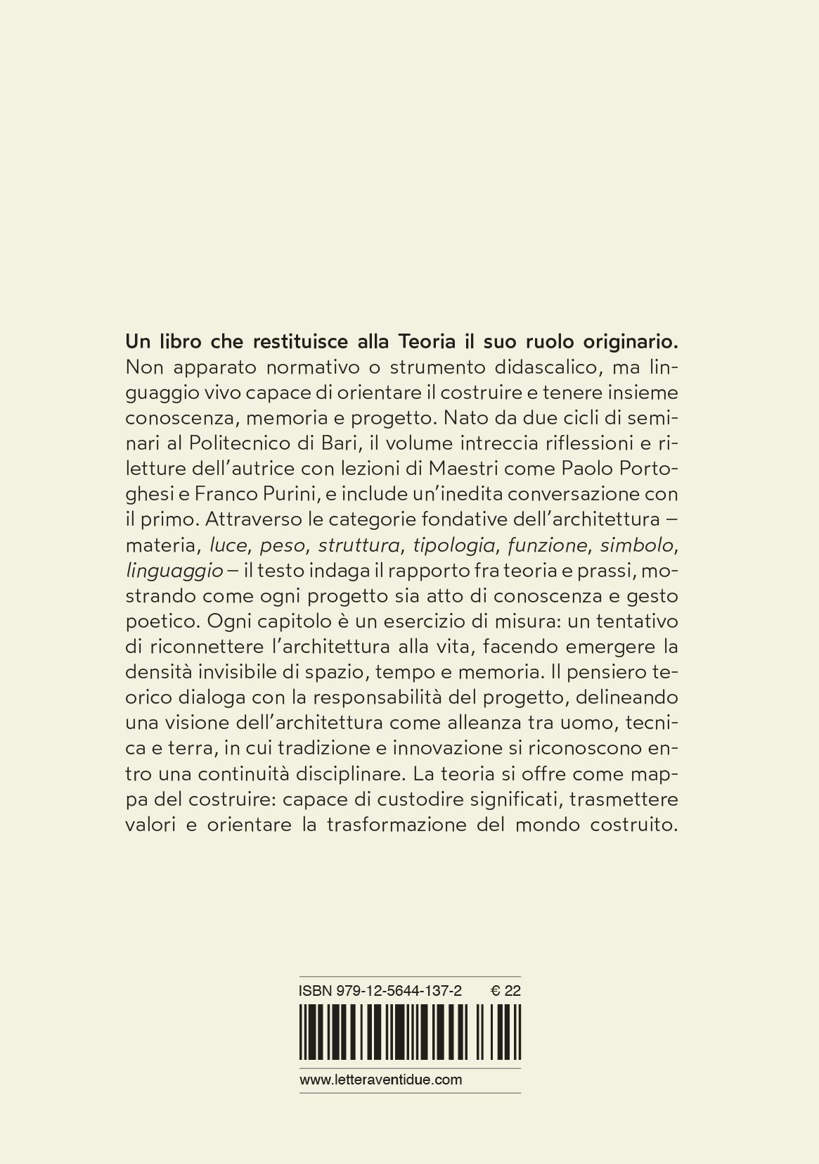 L’architettura si riconosce attraverso tre elementi fondamentali: la materia, che assume forma e significato; la luce, che la modella e la trasfigura; il peso, che la radica e insieme la eleva. In questa triade si manifesta la dimensione poetica e conoscitiva del costruire.