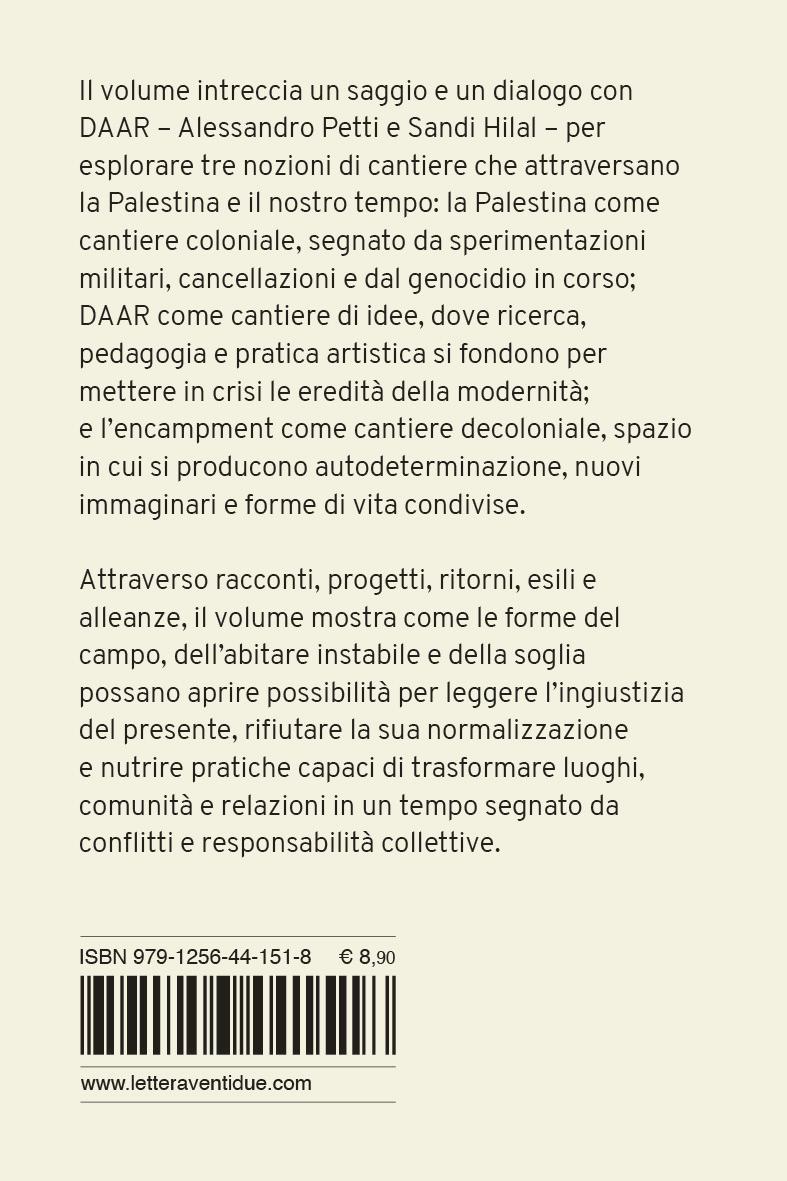 Tre sono i fili che si intrecciano nel saggio e nell’intervista che seguono: la Palestina come cantiere coloniale, DAAR come cantiere di idee, e l’encampment 1 come cantiere decoloniale. Il cantiere è qui inteso non tanto come luogo operativo dell’architettura, ma come figura critica: uno spazio-tempo di instabilità e di sperimentazione, in cui la costruzione e la distruzione coincidono. È il cantiere che si apre “quando la casa brucia”2, per citare Giorgio Agamben, cioè nel momento in cui le strutture simboliche e materiali dell’architettura e dell’occidente si mostrano nella loro crisi più profonda. È in questo collasso che diventa visibile il problema architettonico e politico fondamentale: ciò che quel progetto di civiltà ha cercato invano di edificare e le ragioni profonde del suo fallimento.