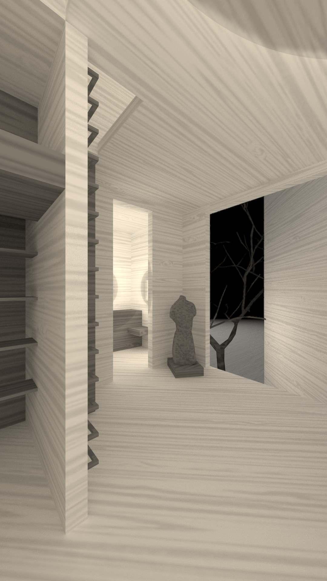 Escaleras para ahorrar espacio ocultas tras un muro. Al ingresar a la casa, no se sabe como acceder al segundo piso. Las escaleras tienen su remate visual al subir. Habitación de la planta baja que tiene su propio remate visual a un jardín. Sólo se accede por una puerta pequeña para evitar el sonido de las aves en esta área. Desde la sala del proyector, la celosía genera curiosidad e intriga ya que no se sabe cómo subir, así como la entrada a la habitación al fondo de la que surge la luz.