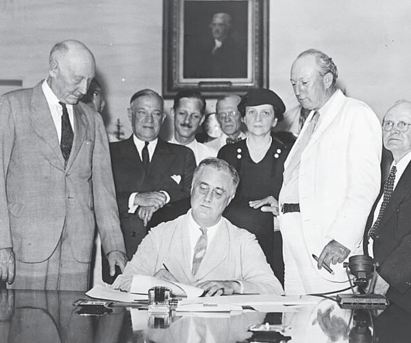 President Franklin D. Roosevelt signs Social Security Act, at approximately 3:30 pm EST on 14 August 1935. Standing with Roosevelt are Rep. Robert Doughton (D-NC); unknown person in shadow; Sen. Robert Wagner (D-NY); Rep. John Dingell (D-MI); Rep. Joshua Twing Brooks (D-PA); the Secretary of Labor, Frances Perkins; Sen. Pat Harrison (D-MS); and Rep. David Lewis (D-MD).