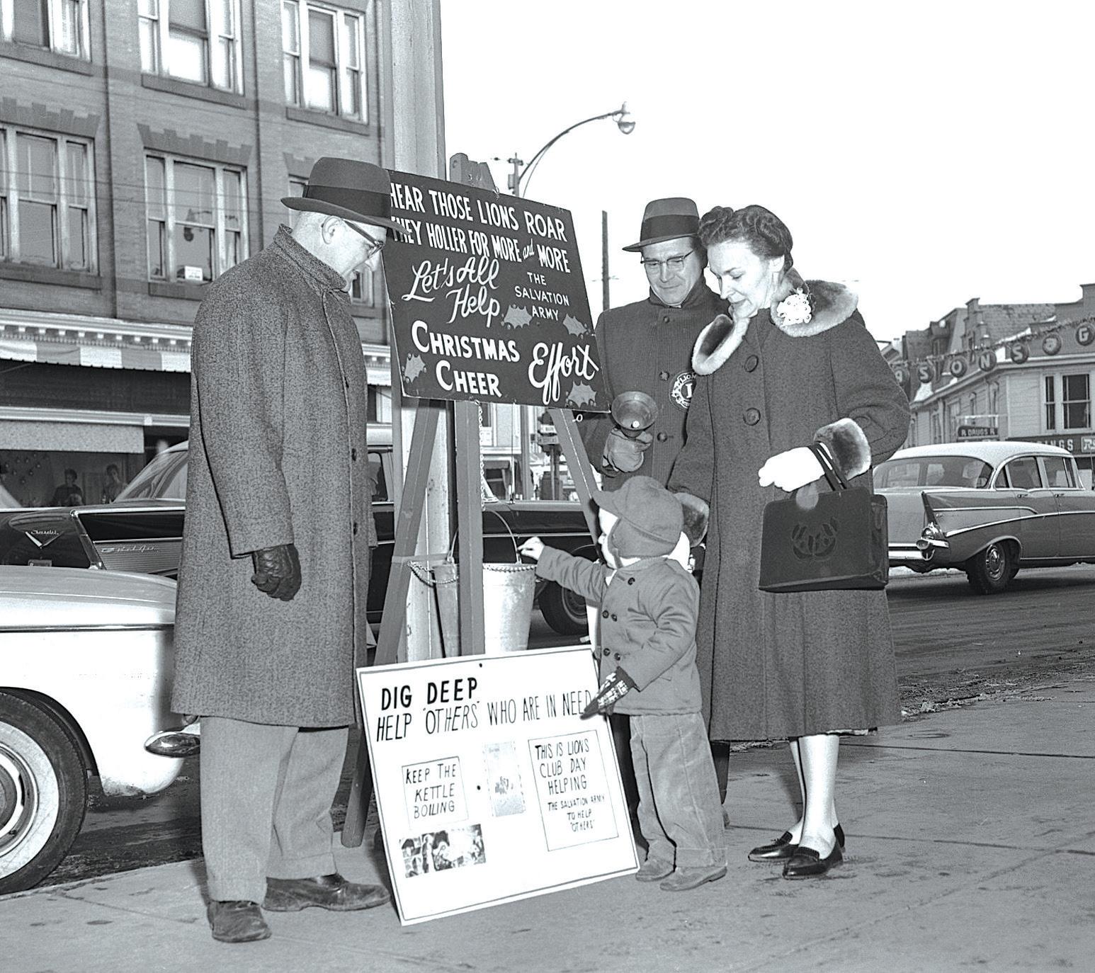 Miffin County Historical Society Lions Club volunteers collect for the needy during the Christmas season in the 1960s. This collection station was set up near the Danks & Company Store at Five Points in Lewistown. Collected funds went to the Salvation Army’s Christmas food basket program.