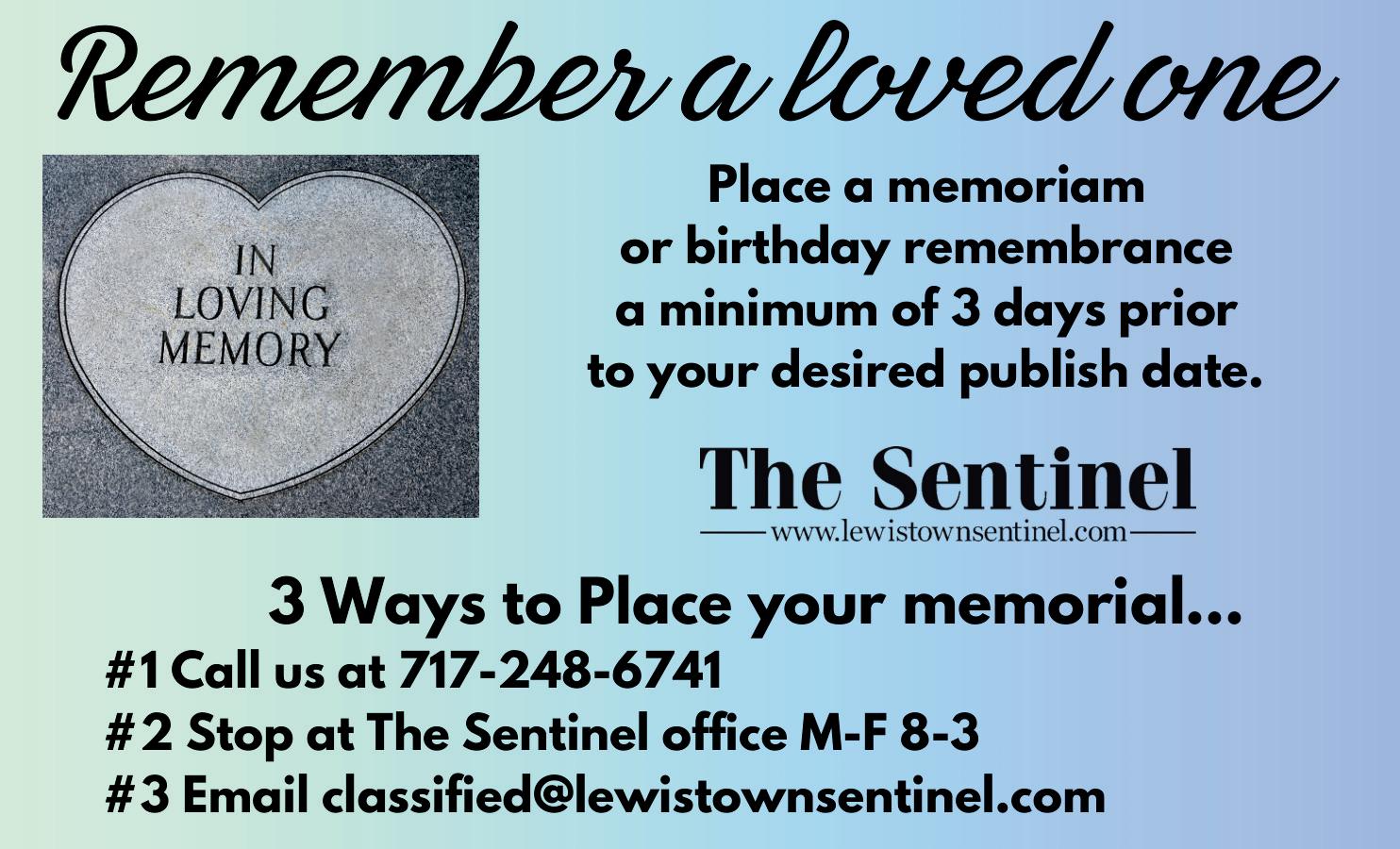 To inquire about how to place an obituary for your loved one, call (717) 248-6741 or email our obituary department at obits@lewistownsentinel.com.
