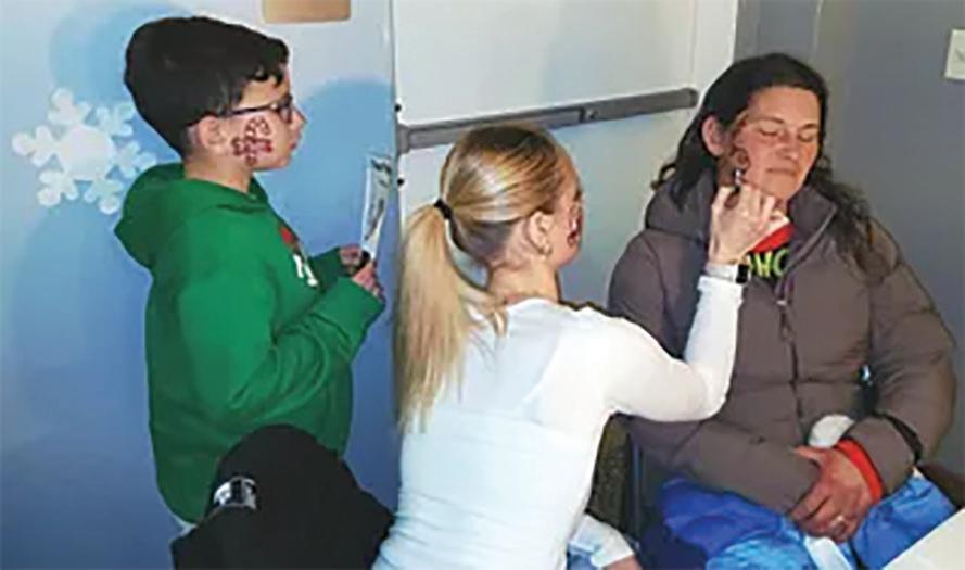 Allie Kaufman of Locust Grove, PA provides enchanting holiday embellishments in the form of face painting at the Belleville Family Christmas Celebration on 12/12/25. Kason Maldonado, 10, watches his mother, Amanda Schaefer, both of Milroy, PA receive a luxe light design.