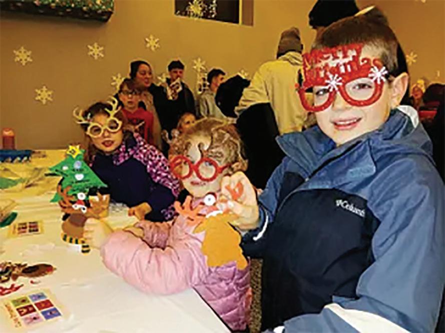 Wyatt Fenby, 7, and his sisters Elaine Fenby, 6, and Juliet Fenby, 4, all of Belleville, are glitter-eyed and giddy to get creative inside the Community Center at the annual Belleville Family Christmas Celebration on 12/12/25.