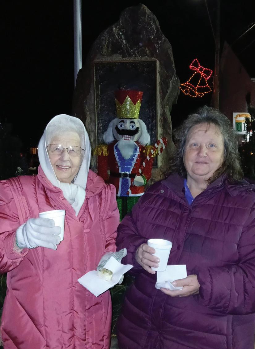 Kate Burke and daughter Lori Kitting, of Mcveytown, PA, cozy up with hot cocoa provided by McVeytown Presbyterian Church and pinwheel sandwiches provided by McVeytown Market at the annual Christmas Around the Square on 12/06/25. Square decorations provided by Sheri Luft, owner of McVeytown OIP.